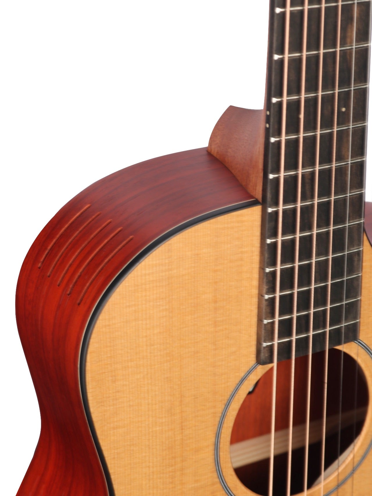 The Pioneer Series boasts a compact mini guitar body shape, perfect for learning, practicing, and traveling. With exceptional playability and a rich, balanced sound, it features Furch's proprietary soundboard voicing process and the Booster Soundport, which reduces internal air pressure within the guitar’s body, allowing the top board to move more freely and produce a stronger, fuller sound with the same strumming effort. Strategically positioned to direct sound toward the player, it ensures you hear your music as clearly and richly as your audience, creating an immersive and authentic performance experience every time you play.